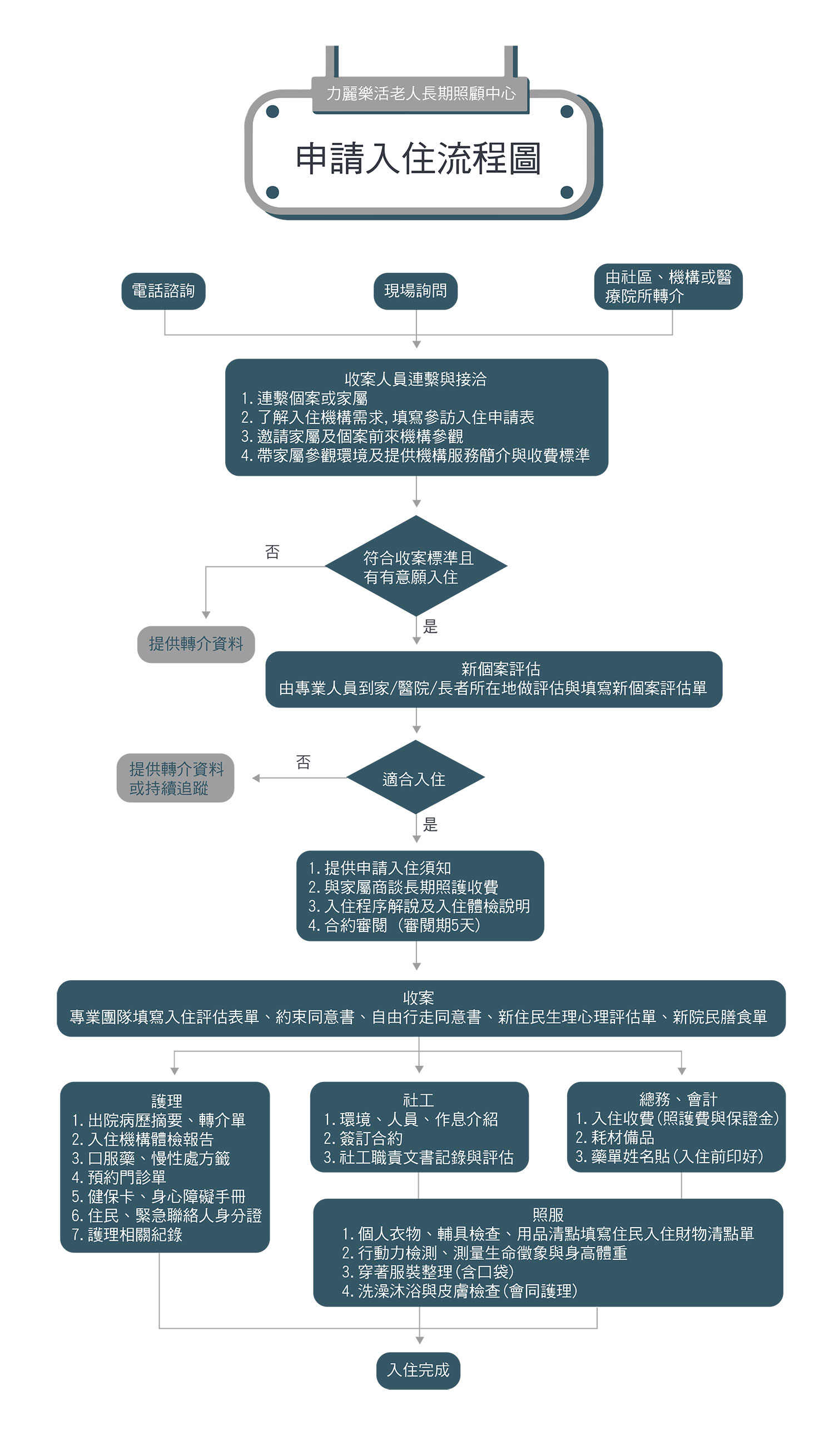 2、照護評估:由護理人員或社工員前往評估個案入住機構的適合性,及個案需求與所需的照護服務。
